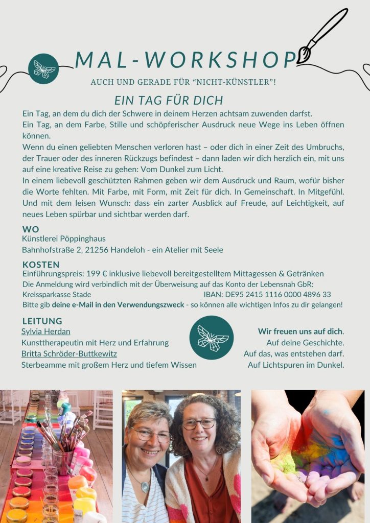 Am 18. Oktober 2025, von 9:30 bis 18:00 Uhr, laden Britta Schröder-Buttkewitz (Sterbeamme) und ich, Sylvia Herdan (Kunsttherapeutin), dich in die Künstlerei Pöppinghaus nach Handeloh ein – in ein Atelier mit Seele, mitten in der Lüneburger Heide.